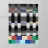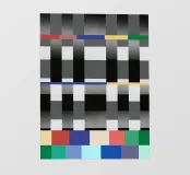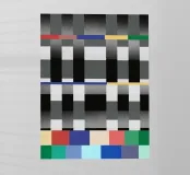 Un motivo geometrico composto da vari rettangoli, con sezioni definite da sfumature di grigio e strisce orizzontali in colori contrastanti come rosso, blu e verde. La disposizione crea un effetto visivo strutturato e vibrante, con i colori che formano una struttura a griglia.