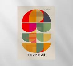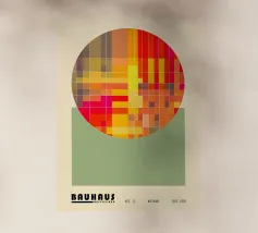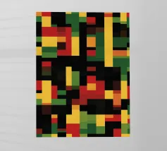 Una composizione di motivi geometrici presenta un cerchio con audaci strisce verticali rosse, gialle e verdi, intersecato da barre orizzontali e circondato da una varietà di rettangoli a scacchi e a tinta unita. Un mix di colori vivaci e tenui, insieme a linee nette, sono i motivi che caratterizzano la composizione.