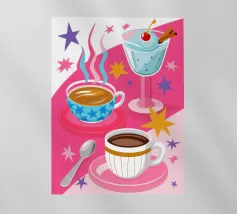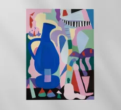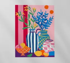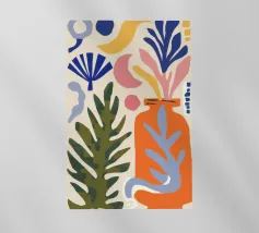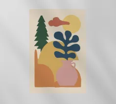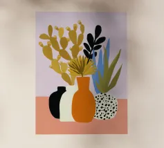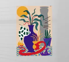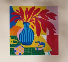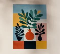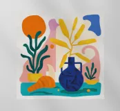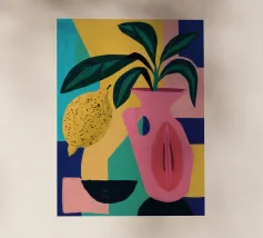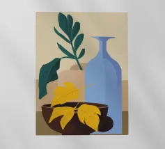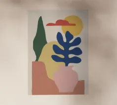 Una moderna natura morta astratta con una pianta stilizzata in un vaso blu, un croissant e forme organiche sotto un sole giallo, il tutto in una composizione equilibrata e calda.