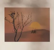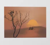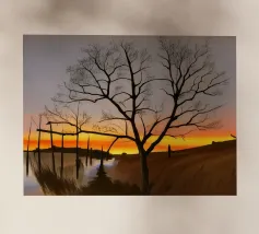 Le sagome di due figure che impugnano canne da pesca si stagliano su un tramonto caldo e luminoso su una dolce collina. In primo piano si trova un albero senza foglie, i cui rami si protendono verso il cielo in questa scena tranquilla.