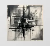 Arte astratta monocromatica - Suite di 2 pezzi intitolata Caos e Struttura - Questo è il pezzo 1 di 2. Linee nere marcate, griglie che si intersecano e schizzi d'inchiostro sparsi convergono in un'esplosione centrale di energia che attira lo spettatore verso l'interno. Strati di lavaggi grigio fumo ammorbidiscono la geometria, creando profondità e atmosfera, mentre elementi lineari nitidi impongono ordine al movimento fluido.