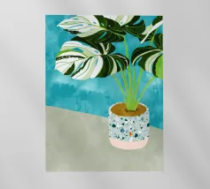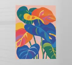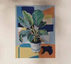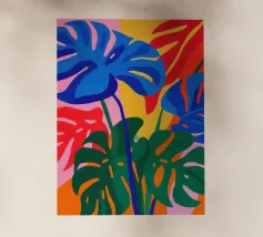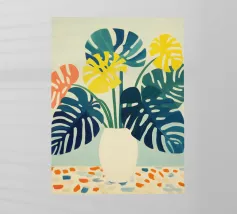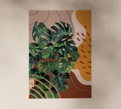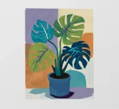 Natura morta contemporanea di una pianta di monstera in un vaso blu. Lo sfondo è un'audace composizione di forme astratte a colori bloccati nei toni della terra, che fonde forme naturali e arte moderna.