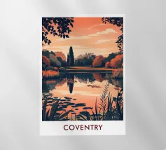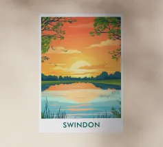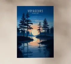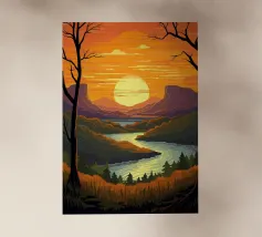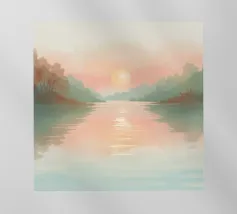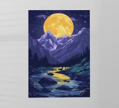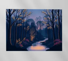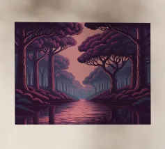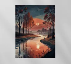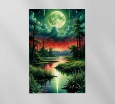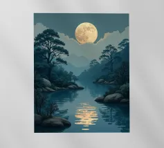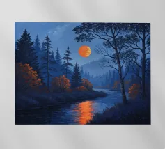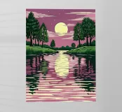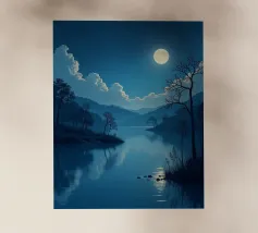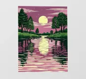 Un dipinto di paesaggio sereno che raffigura un lago calmo che riflette la luna piena su un cielo viola. Gli alberi costeggiano la riva, creando un'atmosfera pacifica.