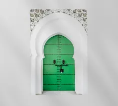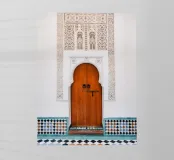 Architettura marocchina a Marrakech. Porta marrone con decorazioni intagliate e piastrelle colorate in nero, verde, arancio e blu.