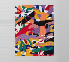 Forme geometriche di vari colori segmentano ordinatamente lo spazio, creando un mosaico di forme astratte. Sfumature di blu, verde, viola, rosso e giallo si intersecano con i contorni neri per dare un effetto vetro colorato.