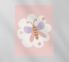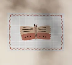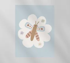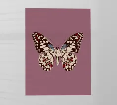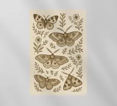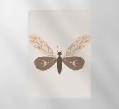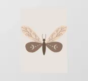 La rappresentazione stilizzata di una falena presenta intricati disegni sulle ali, che incorporano motivi naturali e celesti. Le ali presentano delicati contorni di rami e forme di luna crescente, su una tavolozza di colori tenui.