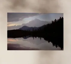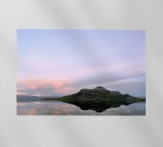 Montagne che si riflettono in un limpido lago di montagna al tramonto, durante l'ora blu, nel nord della Norvegia, nell'arcipelago delle Lofoten.