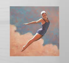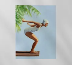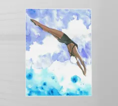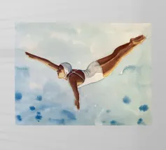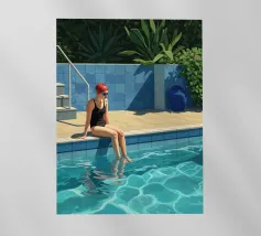 Immersa in una luce liquida, una nuotatrice solitaria indugia sul bordo della piscina, la cui silhouette è ammorbidita dal delicato lavaggio dell'acquerello. Forza e serenità si intrecciano mentre lei guarda nel blu, un momento di quiete sospeso tra movimento e memoria, dipinto con respiro e grazia.