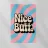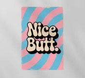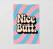 Poster vintage con la scritta "Nice Butt" in grassetto tipografico. Lo sfondo rosa e blu con motivi colorati e vorticosi, la texture giocosa e l'effetto serigrafico retrò creano un design vivace, spiritoso ed elegante con un look vintage.