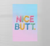 "Nice Butt" in lettere colorate e pastello con un aspetto giocoso e carino su uno sfondo semplice. Design umoristico e affascinante con uno stile estetico e una tipografia moderna.