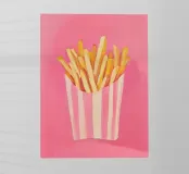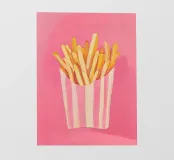 Questa affascinante illustrazione di patatine fritte in una scatola a righe pastello cattura l'aspetto nostalgico e retrò del popolare snack. Con pennellate morbide e un'armoniosa tavolozza di colori rosa, l'opera trasmette una cultura alimentare giocosa e trasforma il fast food in arte culinaria creativa.