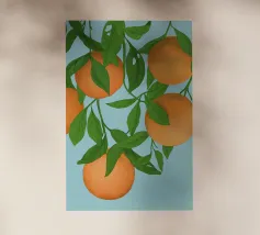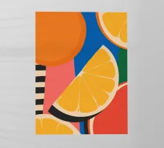 A graphic, pop art style pattern of orange slices against a dark blue background. The composition is modern, vibrant, and a fresh, zesty, and stylish design.