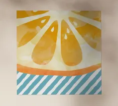 A vibrant, graphic pattern of repeating orange slices against a white and orange striped background. The composition is fresh, zesty, modern, and a cheerful celebration of citrus fruit.