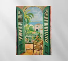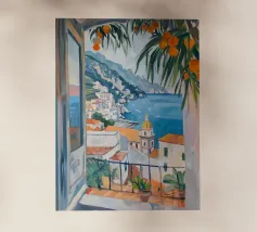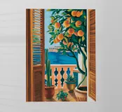Una vista attraverso una finestra di un bellissimo albero di arance, carico di frutti maturi. La luce calda e solare e l'affascinante soggetto creano una scena di rustica abbondanza mediterranea.