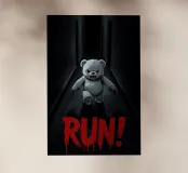 Orsacchiotto minaccioso in un corridoio buio con testo RUN pellicola backlit