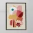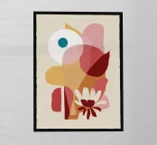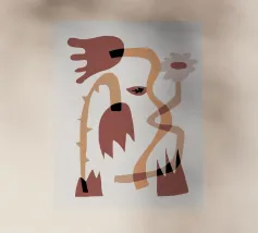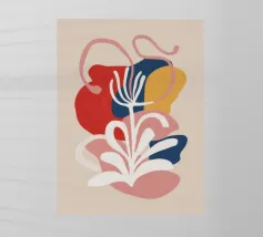 A sophisticated abstract piece with layered, semi transparent shapes in a warm palette of red, pink, and ochre, creating depth and a sense of gentle movement.