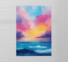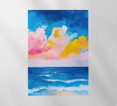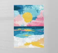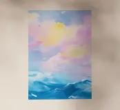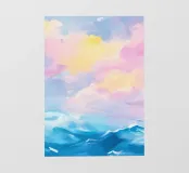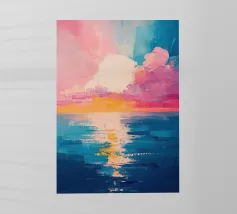 Una scena minimalista vi trasporta in un mondo di pace e armonia. Nuvole rosa e gialle fluttuano in un mare azzurro di nuvole, delicatamente illuminato da una luce soffusa. Le dolci increspature sulla superficie dell'acqua e la fresca tavolozza di colori esaltano l'atmosfera pacifica. Immergetevi in questo mondo da sogno e trovate un momento di relax.