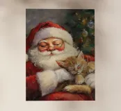 Un'immagine natalizia che scalda il cuore e che infonde sicurezza: Babbo Natale siede rilassato davanti all'albero decorato a festa e tiene in braccio un gattino che dorme pacificamente. I colori tenui e la luce calda conferiscono alla scena una calma magica, simbolo dell'amore, della pace e della tranquilla gioia del periodo natalizio.
