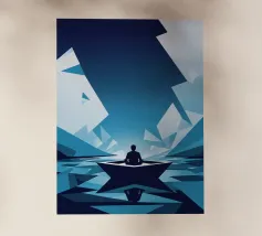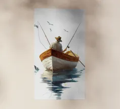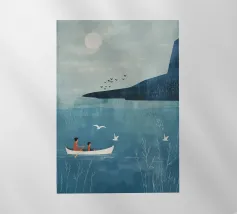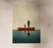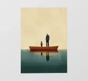 Illustrazione minimalista e piatta di un uomo anziano in piedi sul bordo di una barca con suo figlio. Entrambi guardano lontano dalla macchina fotografica, con uno sfondo semplice e colori tenui che trasmettono un'atmosfera pacifica e serena e un senso di calma nel loro comportamento. L'attenzione è rivolta a catturare espressioni sottili e dettagli che trasmettono profondità senza essere opprimenti o ingombranti. Questo stile riflette il minimalismo scandinavo, pur mantenendo l'intensità emotiva.