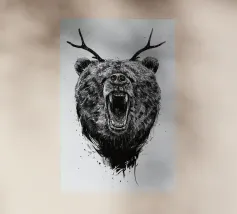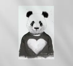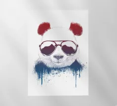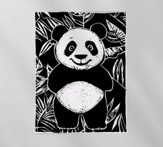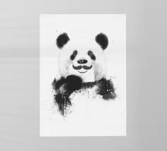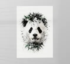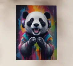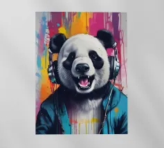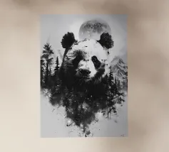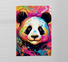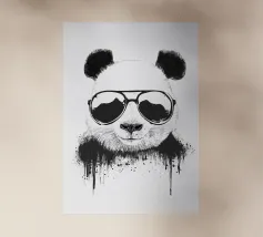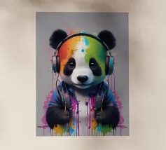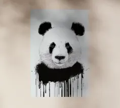 Un panda dal design insolito, con corna e un fiocco ornato, guarda con occhi spalancati su uno sfondo scuro e astratto. La composizione in bianco e nero combina la carineria con il simbolismo oscuro, creando una tensione particolare. Quest'opera d'arte piace agli amanti del gotico, dell'arte urbana e delle rappresentazioni insolite di animali. Ideale per spazi creativi, camere di ragazzi o come regalo accattivante.