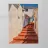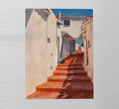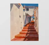 Uno stretto passaggio illuminato dal sole tra edifici bianchi è caratterizzato da una serie di scale rosso cremisi che creano una composizione audace, grafica e architettonicamente interessante, ricca di fascino mediterraneo.