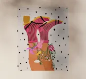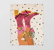 Un'illustrazione stravagante di gambe ornate da calzini rosa a righe e delicati fiori in fiore. Lo sfondo è caratterizzato da giocosi pois neri, che aggiungono un'estetica retrò e moderna. Una fusione di moda e natura, questa opera d'arte emana fascino e creatività.