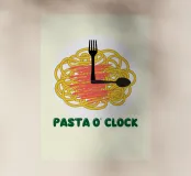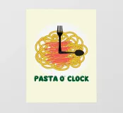 Una grafica giocosa presenta un mucchio di spaghetti con forchetta e cucchiaio disposti come lancette di un orologio, a suggerire che è ora di mangiare la pasta. La frase "PASTA O' CLOCK" è scritta in grassetto sotto.