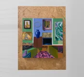 Un'opera d'arte simile a un collage presenta una collezione di dipinti in miniatura incorniciati, diversi motivi ed elementi di natura morta, disposti su uno sfondo strutturato, forse in legno, dalle molteplici tonalità.