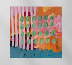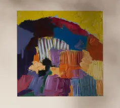 Un'opera d'arte astratta che assomiglia a una trapunta patchwork, con distinte sezioni rettangolari di colore: strisce verticali blu e bianche, verde pieno e un giallo-verde chiaro, che forse rappresenta un paesaggio costiero stilizzato.