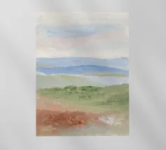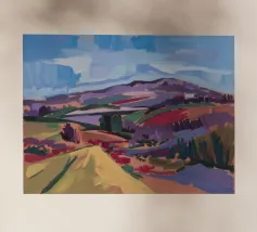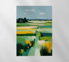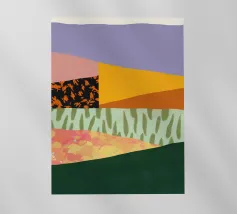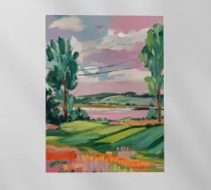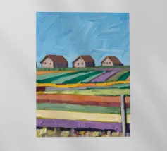 A scenic view of rolling patchwork fields rendered in bold pastels, creating a dreamlike landscape.