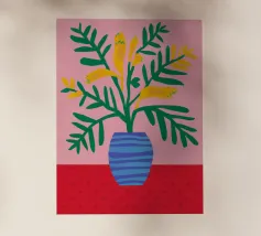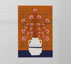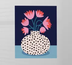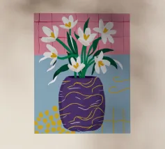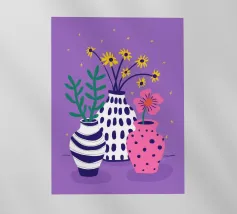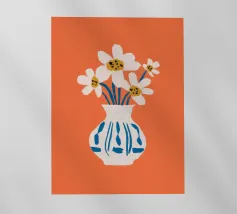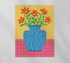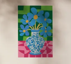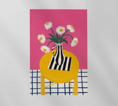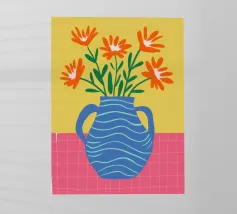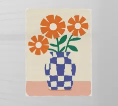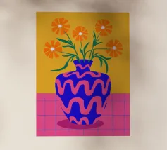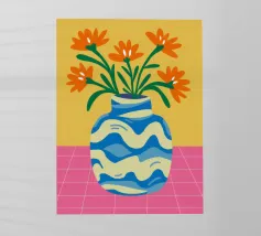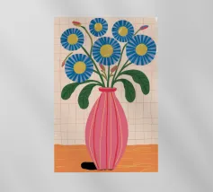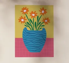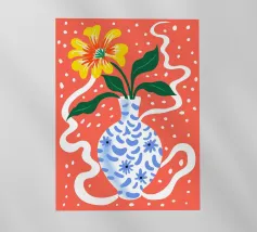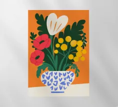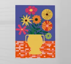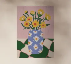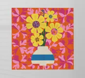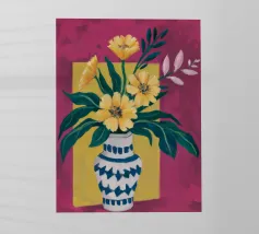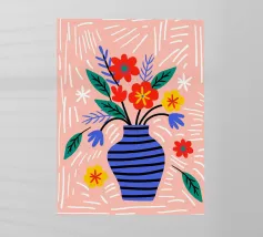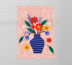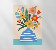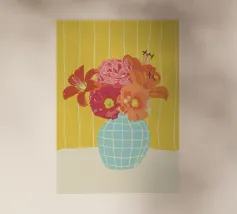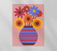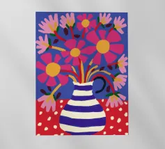 Un vaso a righe bianche e blu contiene fiori gialli e rosa, su uno sfondo vibrante, simile a una trapunta, con motivi floreali rosa, arancioni e rossi.