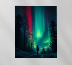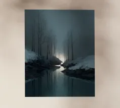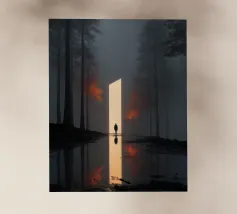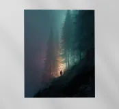 Una scena cinematografica e suggestiva che cattura una figura solitaria che si muove attraverso una foresta avvolta dalla nebbia, al confine tra luce e ombra. Gli alberi ad alto fusto si dissolvono nella foschia mentre una luce soffusa filtra attraverso la nebbia, creando un senso di profondità, grandezza e quieta tensione. Il contrasto tra il vasto paesaggio e la sagoma solitaria evoca quiete, introspezione e un sottile senso di viaggio.