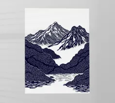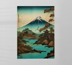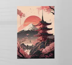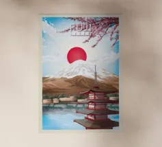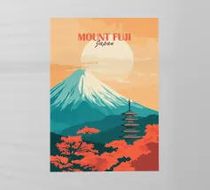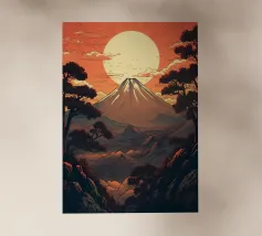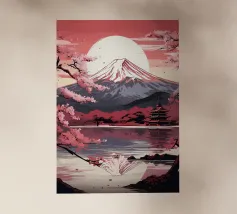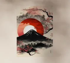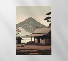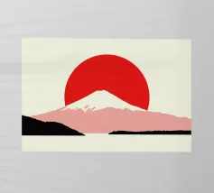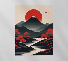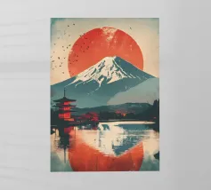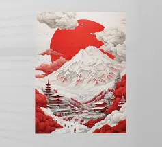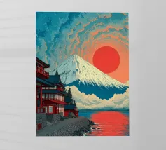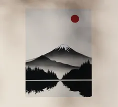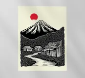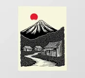 Aggiungete un tocco di Giappone al vostro spazio con questa stampa in stile linoleografico del Monte Fuji. Caratterizzata da linee decise in bianco e nero, case di villaggi tradizionali e un sole rosso vivo, quest'opera d'arte si ispira alle stampe giapponesi su blocchi di legno e al design minimalista. Perfetta per gli appassionati di cultura giapponese, arredamento zen e illustrazioni in stile artigianale.