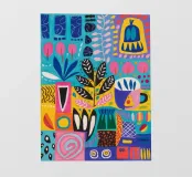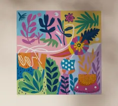 Una griglia di flora astratta, texture e vasi crea un giardino organizzato di giocosa varietà.