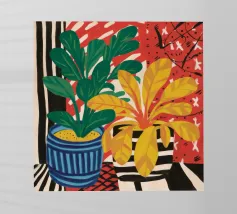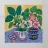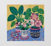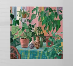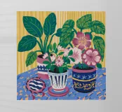 Diverse piante in vaso con fiori e foglie vivaci, in vasi dai motivi unici, disposte su una superficie con un panno a fantasia, creando un'esposizione ricca di texture e colori.