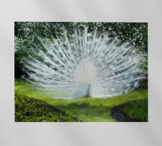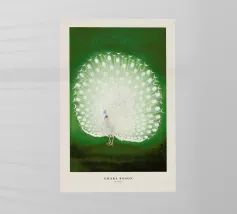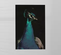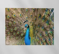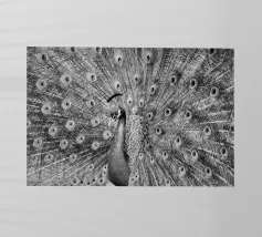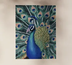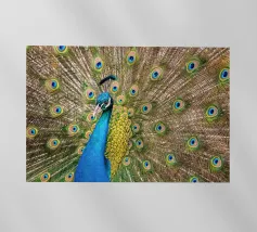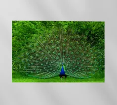Una fotografia straordinaria che cattura un pavone in un'esibizione completa e ipnotica. I ricchi toni gioiello delle piume e l'imponenza della coda ne fanno un'opera d'arte di grande impatto.