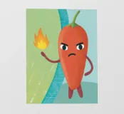 La simpatica illustrazione raffigura un peperoncino rosso con un'espressione arrabbiata e il fuoco nelle mani.