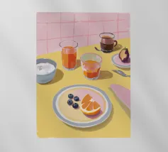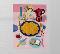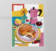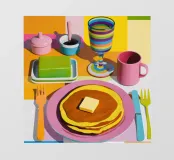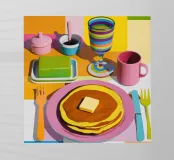 A delicious stack of golden brown pancakes, topped with a melting pat of butter and drizzled with syrup, is the star of this artwork. Presented with colorful mugs, the illustration is a mouth watering celebration of a classic, beloved breakfast treat.