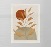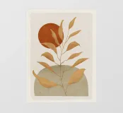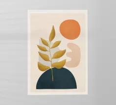 Una composizione botanica astratta con foglie stilizzate e forme geometriche in tonalità calde e naturali.