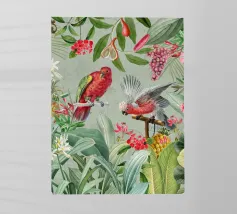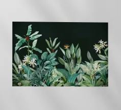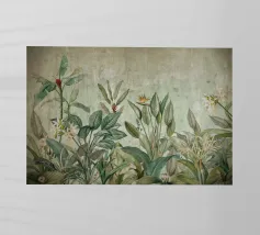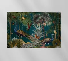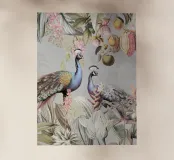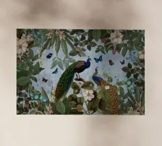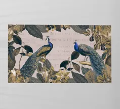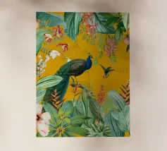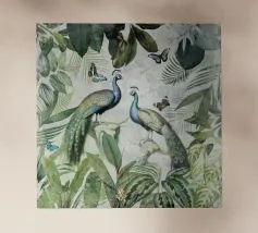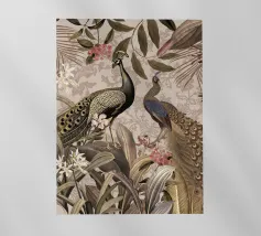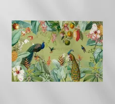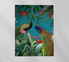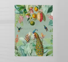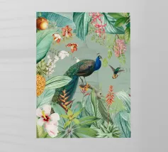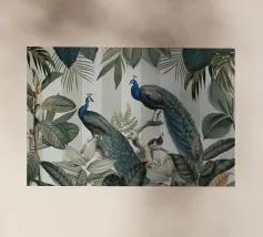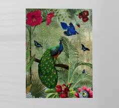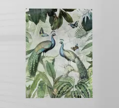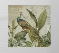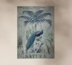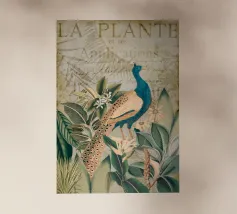 Questo collage vintage cattura l'eleganza dei tropici con una splendida composizione di lussureggianti foglie tropicali e frutti vivaci. Al centro, due splendidi pavoni si ergono con grazia, con le loro piume iridescenti che brillano nei toni del blu, del verde e dell'oro. Il maestoso piumaggio dei pavoni contrasta con il ricco fogliame, aggiungendo un senso di raffinata bellezza. Le sottili texture vintage dello sfondo esaltano l'eleganza generale, mentre i colori vibranti delle foglie e dei frutti danno vita alla scena, evocando un paradiso esotico senza tempo.