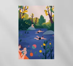 Sotto i rami carichi di frutta e un cielo di un azzurro infinito, l'estate si riversa dolcemente nelle risate e nella luce del sole. L'acqua brilla come un ricordo, morbida e scintillante, mentre conversazioni tranquille e corpi alla deriva scandiscono il ritmo di un pomeriggio senza fretta. Qui tutto sembra impregnato di sole e sospeso, come se la giornata potesse durare all'infinito.