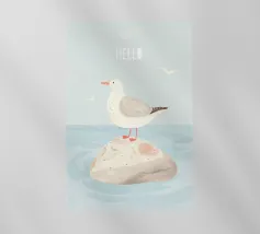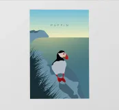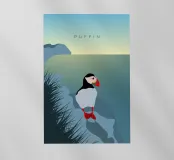Un design di viaggio minimalista con un simpatico pulcinella di mare o puffin sul paesaggio costiero dell'Islanda.