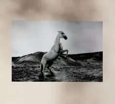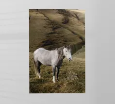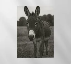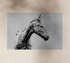 Puledro in piedi in un campo erboso in scala di grigi pellicola backlit