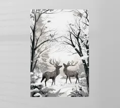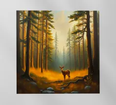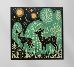 Raffigurazione di due cervi con uccelli in volo in una foresta pellicola backlit