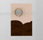 Splendido paesaggio astratto dall'effetto metallico, con un sole brillante in argento e oro con raggi solari disegnati con punti grigi e bianchi e colline scintillanti in marrone, su uno sfondo beige.