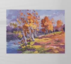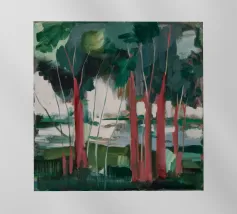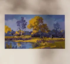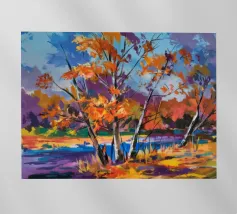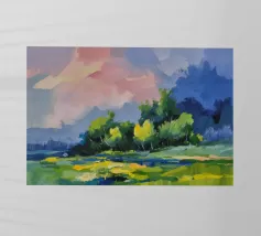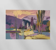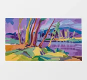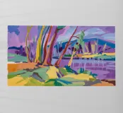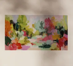 A stylized landscape painting of a river or path winding through a forest. The trees and water are rendered in vibrant, almost psychedelic rainbow colors.