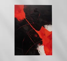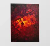Un dipinto digitale astratto e dinamico, caratterizzato da forme geometriche dai contorni netti e dalle vivaci sfumature rosse, arancioni e gialle, su uno sfondo nero e bordeaux intenso. Il disegno evoca calore, energia e contrasto attraverso il colore intenso e la frammentazione angolare.