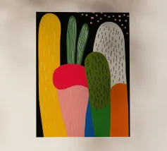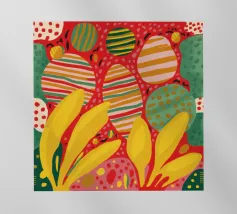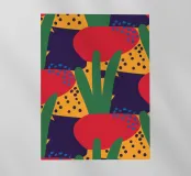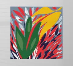 Un motivo vivace ed eclettico con creature rosse stilizzate, forse volpi o gatti, intervallate da vasi e piante colorate. La composizione è un arazzo giocoso e fantasioso di motivi ricorrenti.
