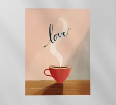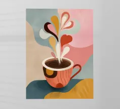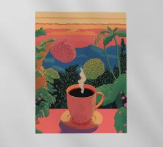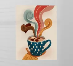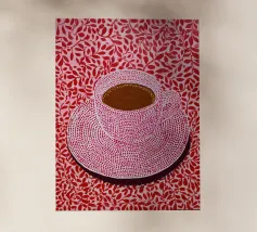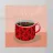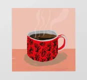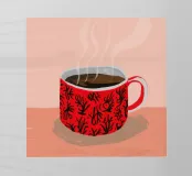 A close up illustration of a steaming hot cup of coffee or tea in a vibrant red mug with a detailed, intricate pattern. The cozy and detailed artwork is a warm invitation to take a break.