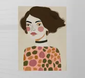Il dipinto raffigura una persona con capelli corti e scuri acconciati a onde, che indossa un abito con motivi retrò e cerchi e diamanti nei toni del rosa, del marrone e del beige. Lo sfondo è di un semplice colore beige chiaro.